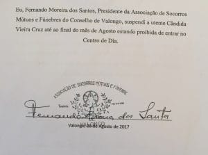 O JNR ouviu Rosa Maria, filha da utente em causa, Cândida Cruz, de 76 anos (as duas na foto). Para a familiar da utente tudo terá começado com “a proibição, decretada pela funcionária familiar do presidente, da utente ajudar a levantar a louça da mesa”. Esta decisão terá provocado uma troca de palavras, que levou à decisão da suspensão por parte do presidente. Para a familiar “a comunicação da decisão teria de explicar as razões da mesma e não explica”, como se pode ler na reprodução da mesma, que publicamos em baixo.