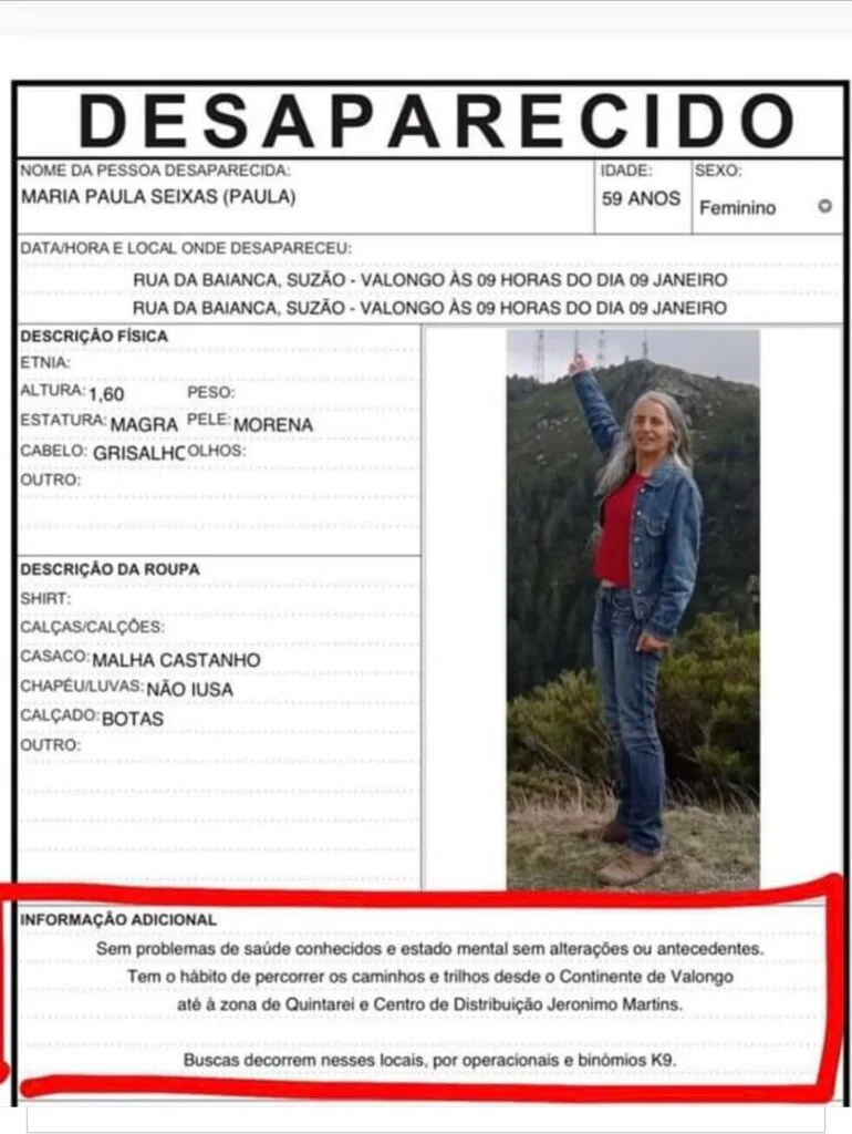 Recorde-se que Maria Paula Seixas foi vista pela última vez na Rua da Baianca, no Suzão, e costumava percorrer vários trilhos entre o Centro Comercial Continente e Quintarei e o Centro de Distribuição Jerónimo Martins, em Sobrado. Qualquer informação sobre o caso deve ser transmitida às autoridades.