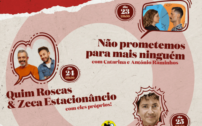 Amanhã, 24 de fevereiro, o mesmo palco receberá, pelo contrário, uma dupla inseparável. Quim Roscas e Zeca Estacionâncio vão animar a noite, também a partir das 21h30.