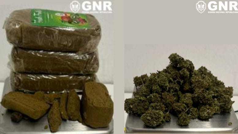 Posteriormente, foi realizada uma busca domiciliária que permitiu a apreensão de mais 284 doses de haxixe, nove doses de liamba, duas balanças de precisão, uma faca para o corte da droga e um rolo de película aderente, utilizado no embalamento do produto.