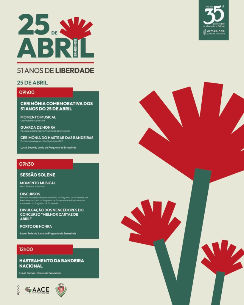 A Junta de Freguesia de Ermesinde preparou um conjunto de iniciativas para comemorar os 51 anos do 25 de Abril, destacando-se a participação da comunidade local, associações culturais e entidades oficiais.