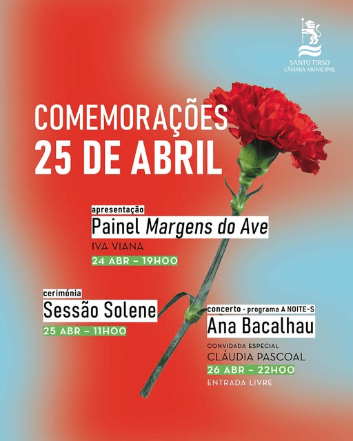 A cerimónia oficial comemorativa do 25 de Abril decorrerá às 11h00, no átrio da Câmara Municipal de Santo Tirso, reunindo representantes institucionais e a comunidade para assinalar a importância da democracia e da liberdade.
