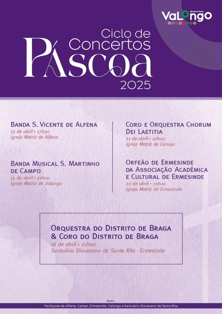 O habitual Concerto de Páscoa promovido pelo Município de Valongo transforma-se este ano num Ciclo de Concertos de Páscoa, com cinco apresentações agendadas para diferentes igrejas do concelho, entre os dias 13 e 22 de abril de 2025.