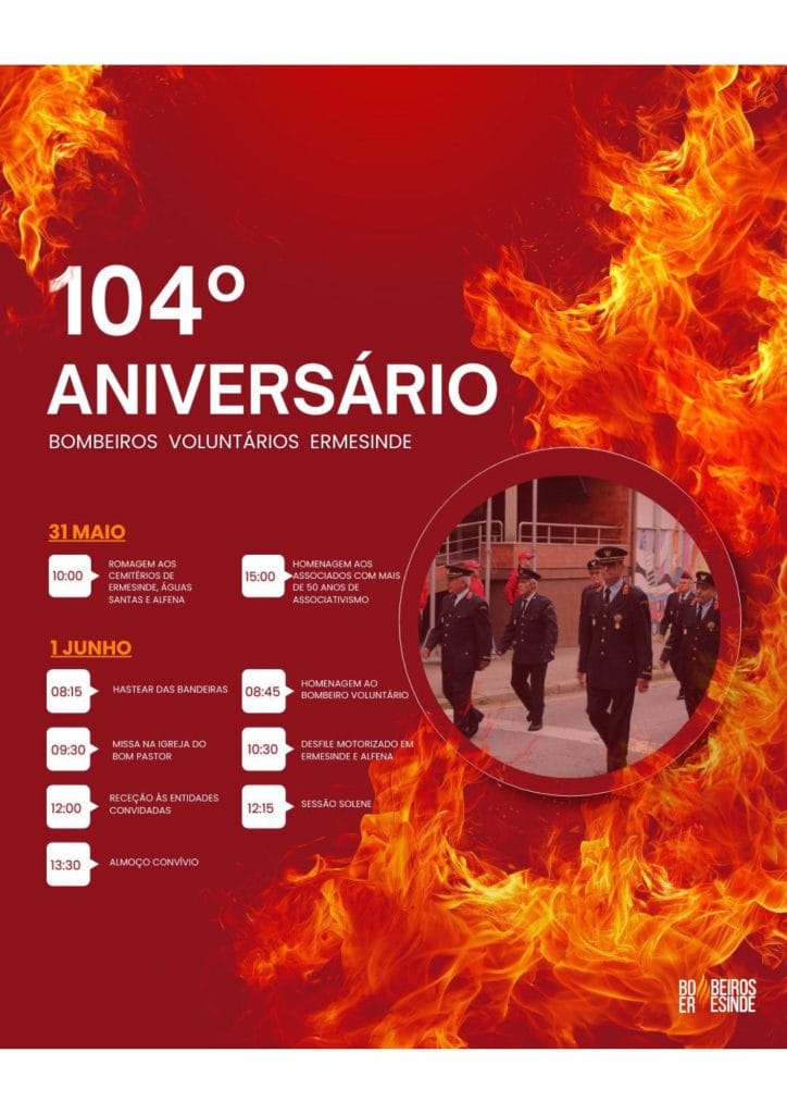 A Associação Humanitária dos Bombeiros Voluntários de Ermesinde assinala, no próximo dia 1 de junho, o seu 104.º aniversário, com um programa comemorativo que se estende por dois dias e que homenageia mais de um século de serviço à população.