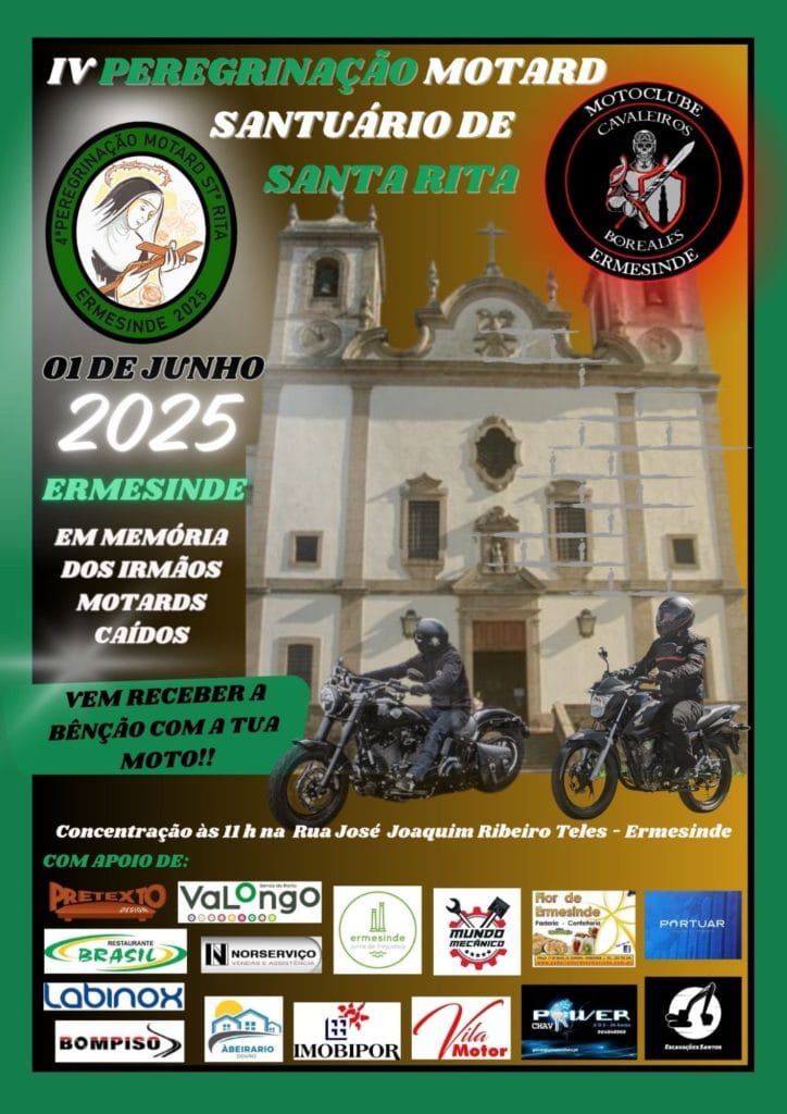 No próximo dia 1 de junho, os Cavaleiros Boreales, motoclube de Ermesinde, organizam a IV Peregrinação Motard ao Santuário de Santa Rita, uma tradição que honra a memória dos “irmãos motards caídos” e celebra a bênção das motos e dos seus condutores.