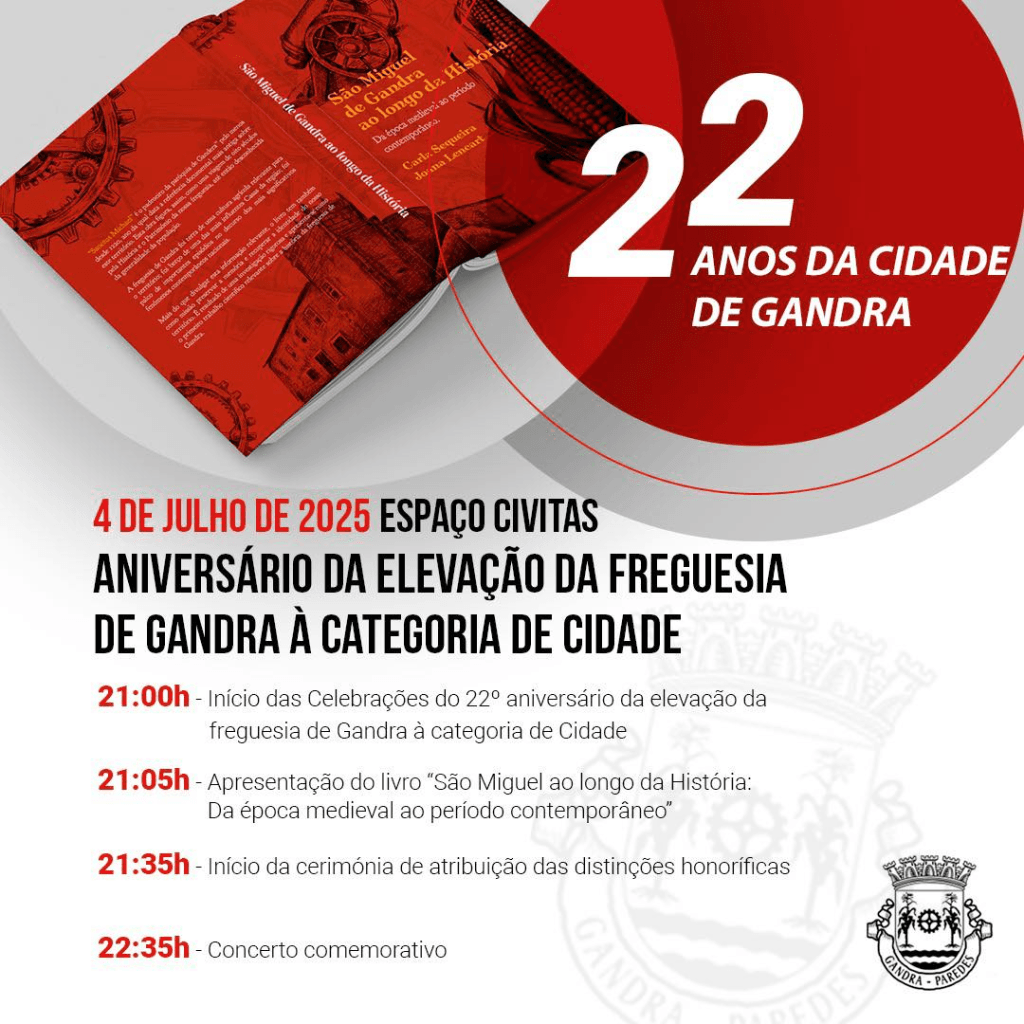 No próximo dia 4 de julho, a freguesia de Gandra vai assinalar os 22 anos da sua elevação a cidade com uma cerimónia que inclui o lançamento de um livro sobre a história local e a atribuição de distinções honoríficas a personalidades e instituições que contribuíram para o prestígio e desenvolvimento da freguesia.