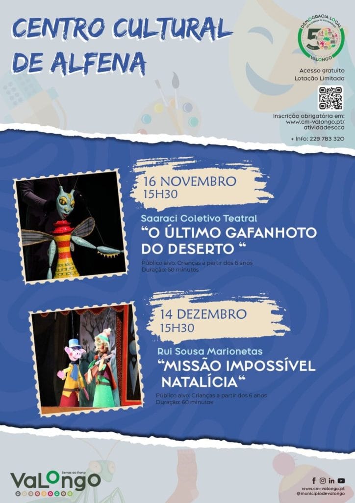 A programação do Centro Cultural de Alfena inclui ainda outros espetáculos para os próximos meses: 16 de novembro – “O Último Gafanhoto do Deserto” e 14 de dezembro – “Missão Impossível Natalícia”, ambos às 15h30 e com duração de 60 minutos, continuando a aposta na oferta cultural para famílias e crianças.