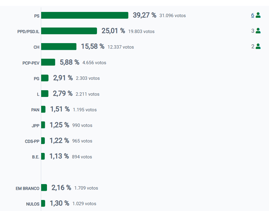 Na Assembleia Municipal o PS conseguiu 14 eleitos, o PSD 10, o Chega 2, CDU 2 e Livre 1.