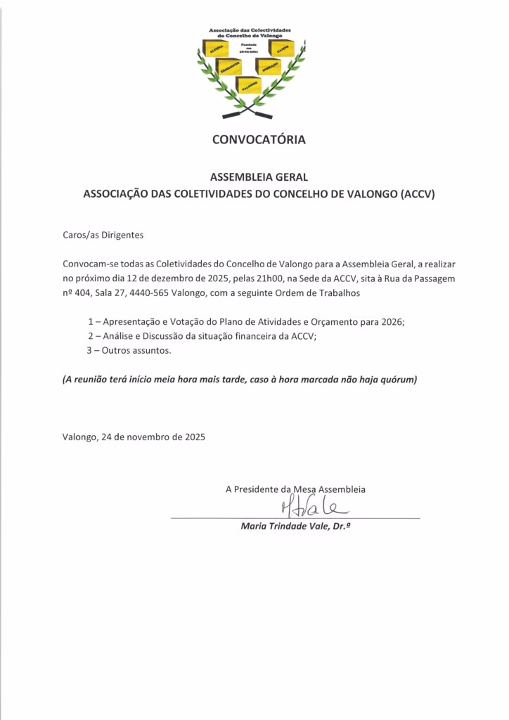 A Associação das Colectividades do Concelho de Valongo torna pública a convocatória para a Assembleia Geral, que vai ter lugar no dia 12 de dezembro, pelas 21h, na sede da ACCV, para apresentação e votação do plano de atividades para 20265, apelando à presença do movimento associativo.