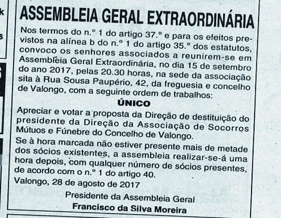 Convocada Assembleia para demitir presidente – Socorros Mútuos de Valongo em polvorosa